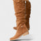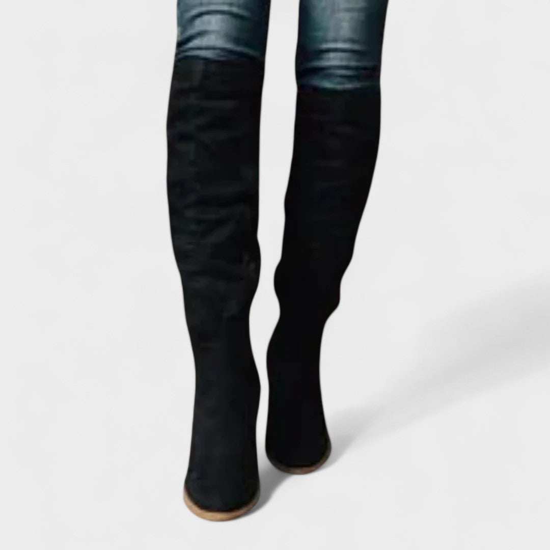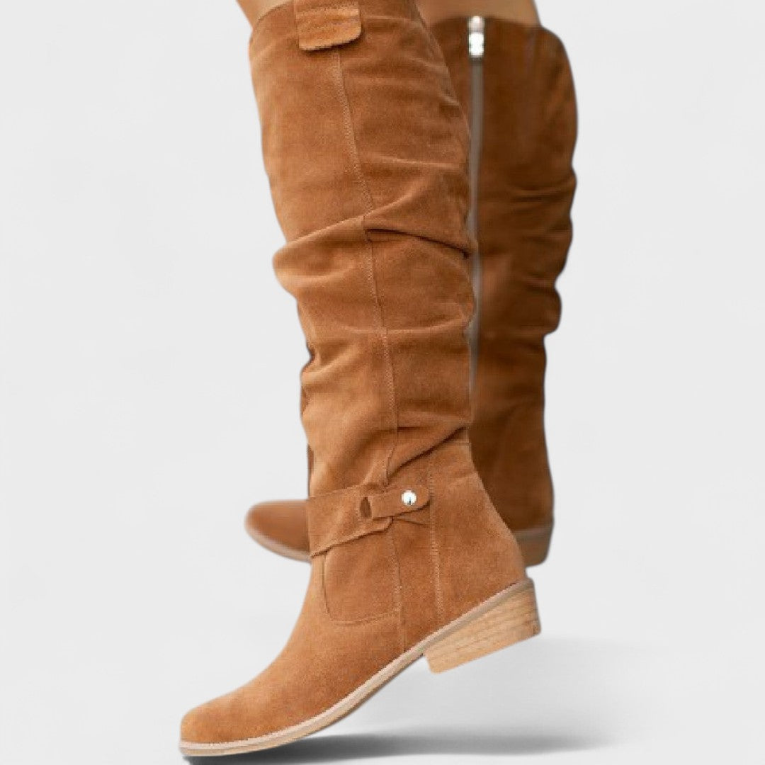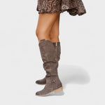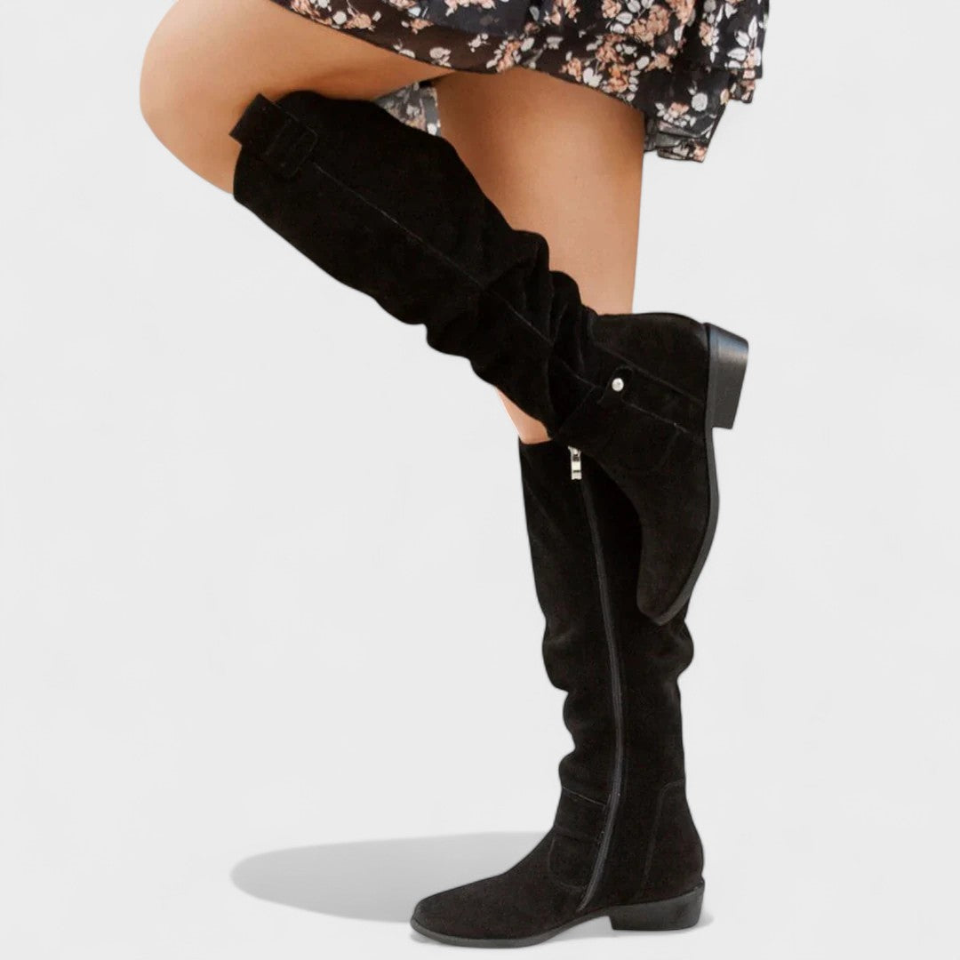Ti visoki petki prinašajo urbano eleganco in udobje v enem koraku. Mehka, lahka zgornji del s elegantnimi gubami se prilega nogi in daje sproščen, rafiniran videz. Stranski zadrge omogočajo hitro obuvanje, medtem ko nizka blokasta peta nudi stabilnost čez ves dan.