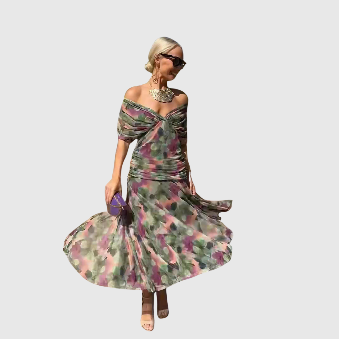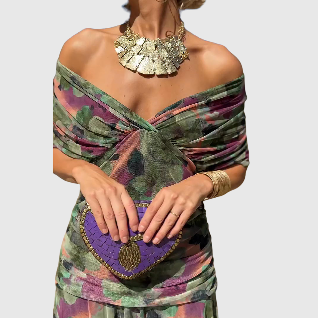 Alma obleka je popolna kombinacija elegance in ženstvenosti. Dolg kroj in V-izrez subtilno poudarita postavo.