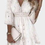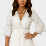 Potopite se v brezčasno eleganco s to čudovito oblikovano mini obleko z čipko. Ta obleka je popolna izbira za posebne priložnosti, poletne zmenke ali nastope neveste.