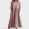 Doživite občutek svobode z Mehko Bombažno Obleko s Prijaznim Krojem. Njena mehka "A" silhueta se prilagodi pod prsmi in prosto pada čez trebuh, kar zagotavlja udobje skozi ves dan – idealna za sproščene dni ali manjše naloge.
