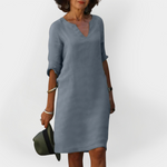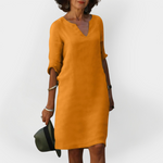 Elegantna črna obleka z V-izrezom in udobno silhueto prinaša stil in udobje v vaše vsakdanje življenje.