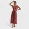 Dopustite si, da vas objame ta prostorna midi plisirana obleka v terakotnem odtenku. Njena globoka V-izreza in poudarjena linija pasu ustvarjata ženstven in rafiniran silhuet, medtem ko gladka tkanina zlahka sledi vašim korakom.