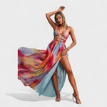 Karina - Elegantna in Sproščena Obleka ustvarja nepozaben vstop s svojo gladko silhueto in živahnim akvarelnim dizajnom. Popolna je za morske praznike, tropske počitnice ali kateri koli trenutek, ki zahteva izjemno eleganco.