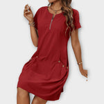 Osvežite svojo vsakdanjost s to bordo obleko s kratkimi rokavi. Njen preprost in udoben dizajn prinaša stil brez pretiravanja, idealna za vsak dogodek.