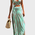 Povišajte svoj poletni videz s to osupljivo obleko v mint barvi z modernimi izrezi. Popolna za počitnice, plaže in stilne večere.