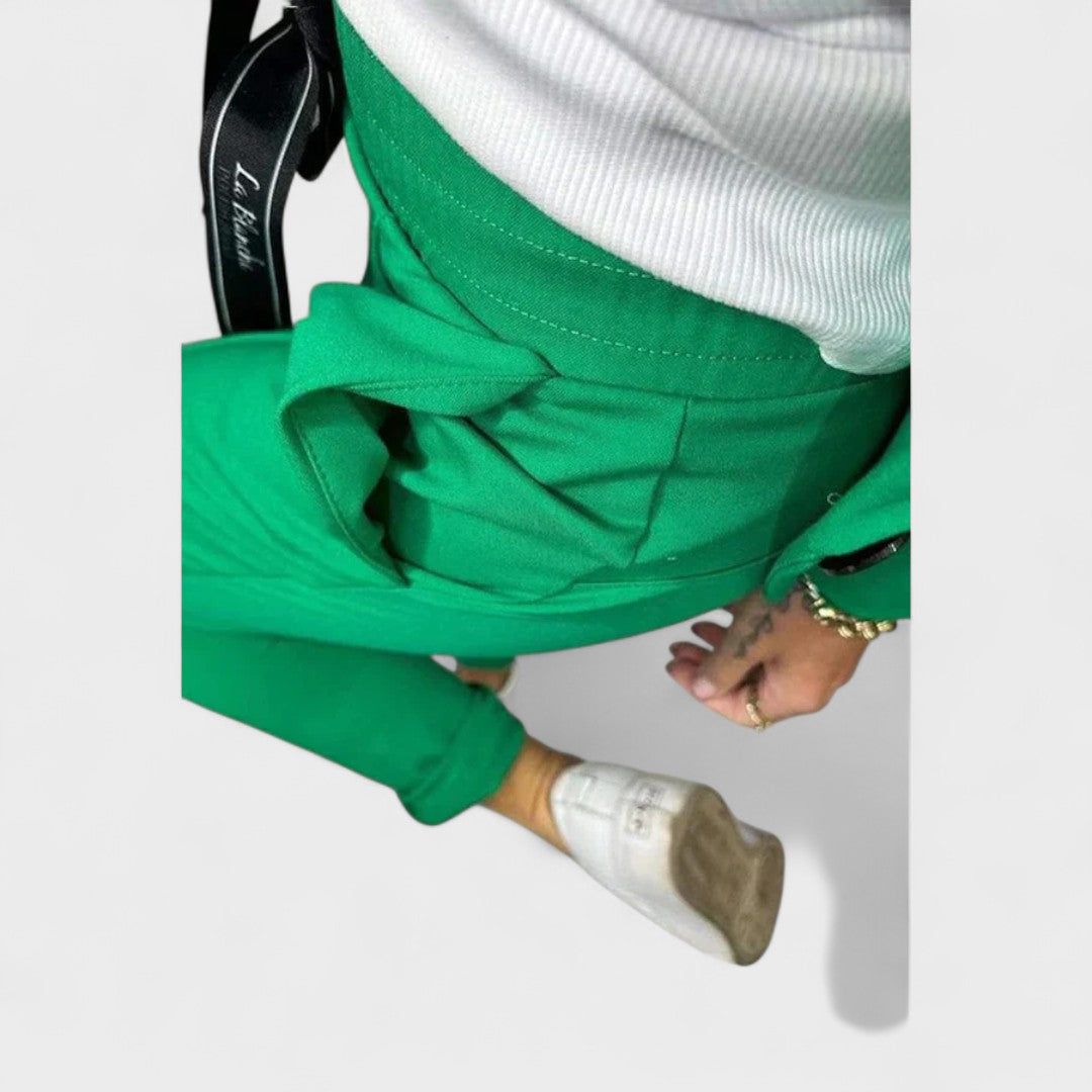 Zelena barva tega kompleta dodaja svežino in moderen, a vedno chic videz. Idealen je za tiste dneve, ko želite biti samozavestni, a hkrati popolnoma neobremenjeni z izbiro oblačil. Povežite ga s preprosto belo majico ali s stiliziranim topom za popoln vsakdanji ali sproščeni poslovni izgled.