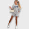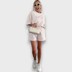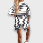 Dinamičen set za vsakdanje videze združuje stil in udobje v enem. Oversized majica se popolnoma ujema z visokim pasom kratkih hlač, kar ustvarja edinstven in moderen videz.