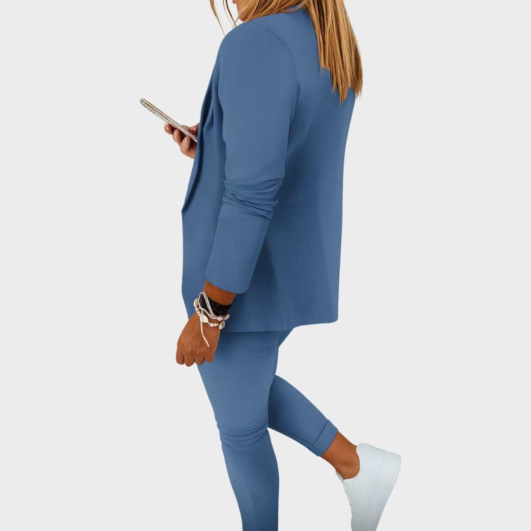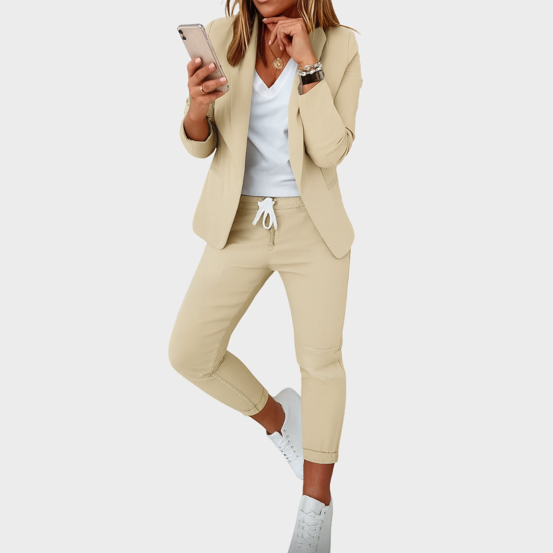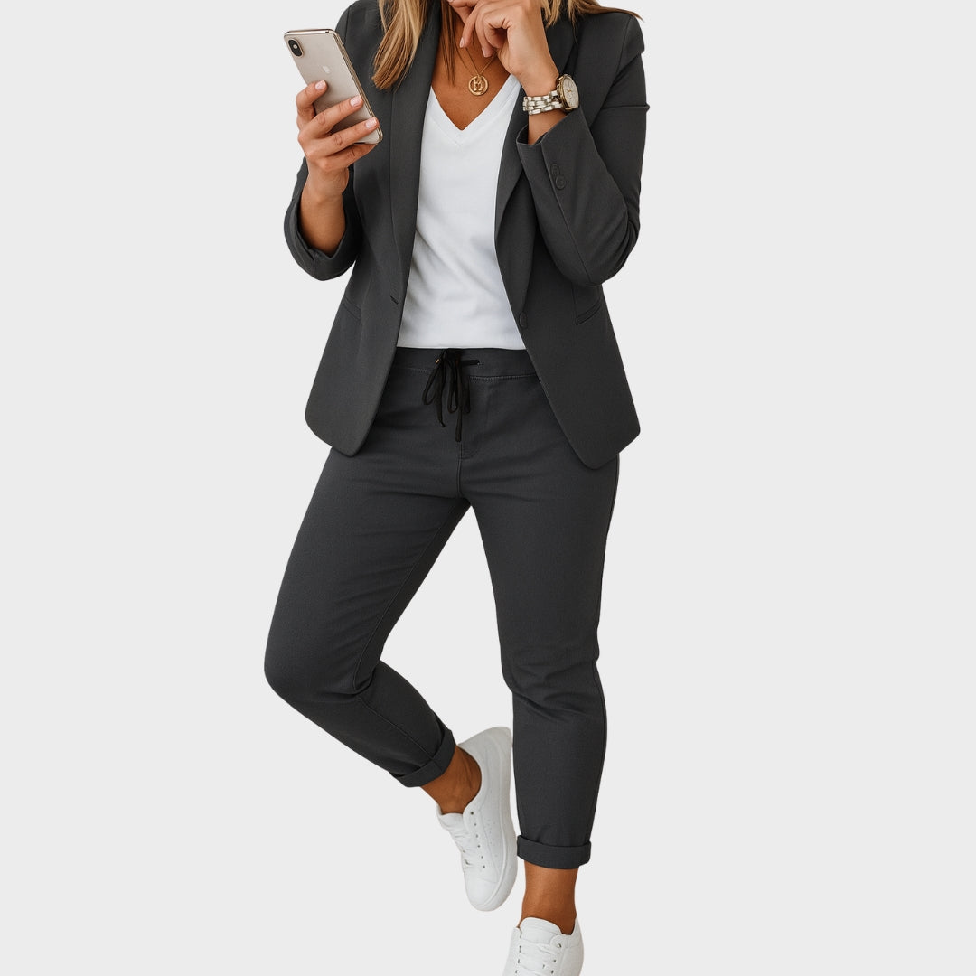 Sofisticiran Set: eleganca in udobje v vsakem kosu. Ta set združuje brezčasno oblikovanje z visokokakovostnimi materiali, kar ponuja udoben in vsestranski videz, ki pušča dober vtis.