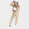 Elegantni komplet v peskasti barvi nudi udobje in stil, kar ga naredi popolnega za vsakodnevne videze ali priložnostne sprehode. Moderna zasnova združuje oprijet jakno z zadrgo in ozke hlače, ki skupaj ustvarjata športno vzdušje.