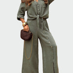 Ženski kombinezon v elegantni kaki barvi združuje udobje in brezskrbno eleganco. S svojimi ključnimi značilnostmi, kot so: