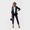 Izjemen kostum, ki izžareva samozavest in žensko moč. Ta blazer z zlatimi gumbi in oprijet silhuet hlač ustvarja popolno kombinacijo za profesionalne videze ali elegantne nastope.