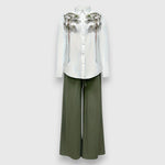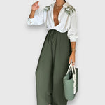 Nivana komplet združuje eleganco in udobje v enem. Sestavljen iz bluze s subtilnim cvetličnim vzorcem in širokih hlač, je odlična izbira za stilne dni.