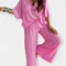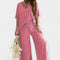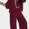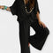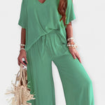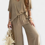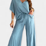 Uživajte v sproščeni eleganci s tem kompleti, ki združuje široke hlače in bluzo z V-izrezom. Široke hlače omogočajo prosto gibanje in vsakodnevno udobje, medtem ko bluza z širokimi rokavi dodaja karakter in lahkotnost.