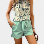 Halter vrh ponuja moden kroj, ki poudarja ramena, medtem ko ujemajoče kratke hlače z pasom zagotavljajo stil in udobje za vsakodnevne izlete.
